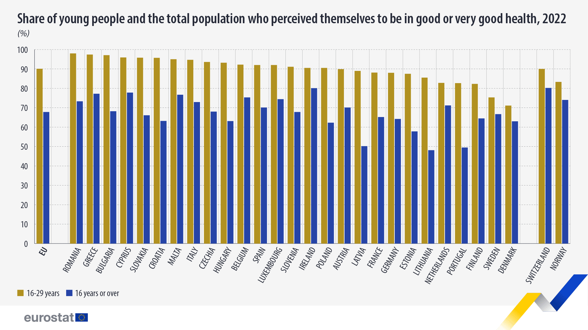 Στην Ευρωπαϊκή Ένωση, το 90,1% των νέων ηλικίας μεταξύ 16 και 29 ετών θεώρησαν ότι έχουν καλή ή πολύ καλή υγεία το 2022. Οι χώρες της ΕΕ με τα υψηλότερα ποσοστά νέων που θεωρούν ότι έχουν καλή ή πολύ καλή υγεία ήταν η Ρουμανία (98,0%), η Ελλάδα (97,4%) και η Βουλγαρία (97,1%). Τα χαμηλότερα ποσοστά καταγράφηκαν στη Δανία (71,1%), στη Σουηδία (75,3%) και στη Φινλανδία (82,3%).