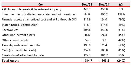 ❖ Μείωση των Απαιτήσεων λόγω αναταξινόμησης του κλάδου Περιβάλλοντος (€68,6 εκ.) στα Περιουσιακά Στοιχεία που κατατάσσονται ως διακρατούμενα προς πώληση, καθώς και αποπληρωμές δανείων από τις εταιρείες ΑΚΤΩΡ (€72,5 εκ.), Θερμαϊκή Οδός (€21,3 εκ.) και Αυτοκινητόδρομος Αιγαίου (€57,4 εκ.).