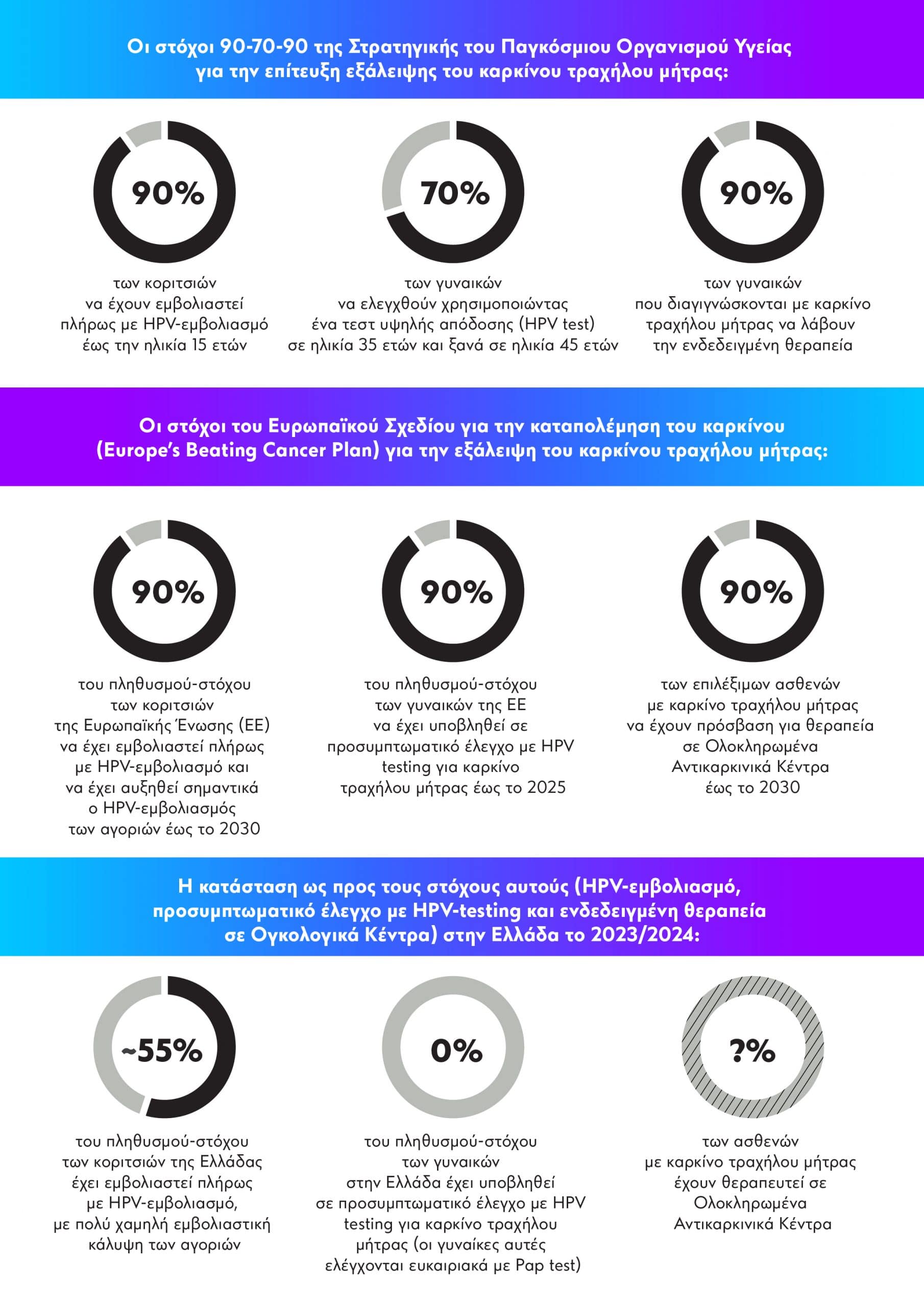 Ως εκ τούτου, για να καταστεί δυνατή και στην Ελλάδα η επίτευξη των στόχων της Παγκόσμιας Στρατηγικής του Π.Ο.Υ. και της Ευρωπαϊκής Επιτροπής, με απώτερο σκοπό την εξάλειψη του καρκίνου τραχήλου μήτρας και στην χώρα μας, απαιτείται όπως προβεί η Ελληνική Πολιτεία σε κατάλληλες και επιβεβλημένες ενέργειες, οι οποίες θα πρέπει να έχουν τους εξής στόχους για το έτος 2030: