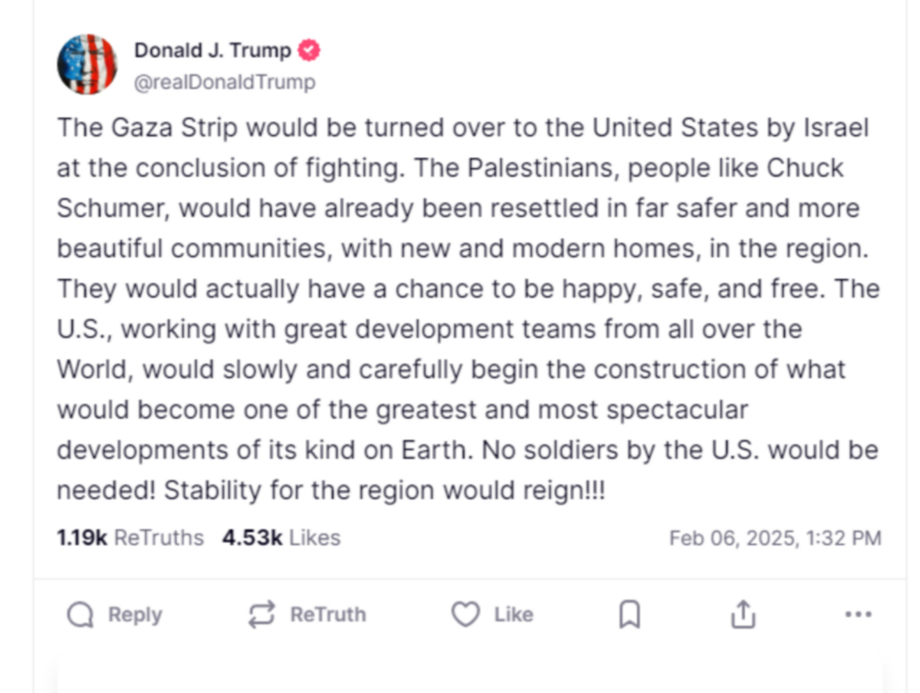 “Η Λωρίδα της Γάζας πρέπει να παραδοθεί στις ΗΠΑ από το Ισραήλ με τη λήξη του πολέμου. Οι Παλαιστίνιοι θα έχουν ήδη μετεγκατασταθεί σε πιο ασφαλείς και πιο όμορφες κοινότητες στην περιοχή, σε νέα σπίτια”, ανέφερε σε ανάρτησή του στο Truth ο πρόεδρος των ΗΠΑ, επαναλαμβάνοντας την δήλωση που προκάλεσε την οργή όλου του πλανήτη την περασμένη Τρίτη.
