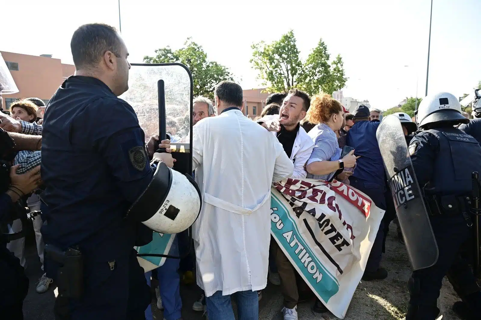 Επεισόδια σημειώθηκαν έξω από το νοσοκομείο «Αττικόν» την ώρα της επίσκεψης του πρωθυπουργού Κυριάκου Μητσοτάκη και του Αδώνιδος Γεωργιάδη.