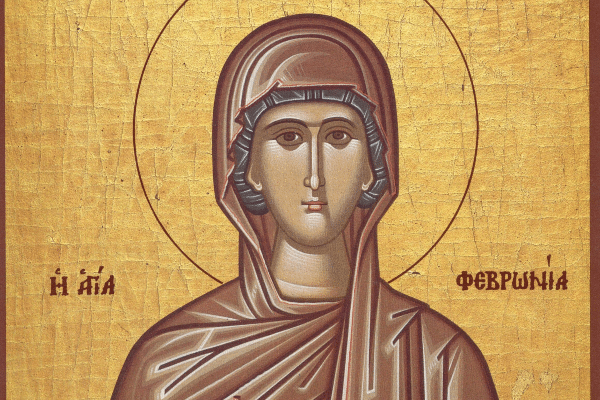 Η Αγία Φεβρωνία ήταν περιζήτητη νύφη για την εξαιρετική ομορφιά της, αλλά εξίσου λαμπερή ήταν και η αγνή ψυχή της. Στα 17 της χρόνια, αποφάσισε να ακολουθήσει τον δρόμο της άσκησης και της εγκράτειας, επιλέγοντας να γίνει μοναχή στο μοναστήρι όπου η ηγουμένη ήταν η θεία της, Βρυένη, στην Μεσοποταμία (στην πόλη της Νισίβεως, γνωστή και ως Αντιόχεια της Μυγδονίας, στα σύνορα Βυζαντινού και Περσικού κράτους).