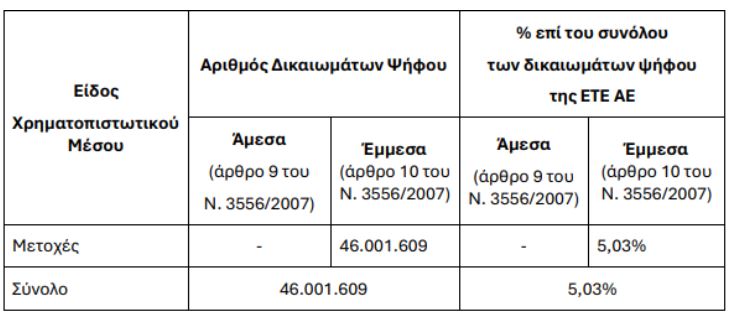 Σε συνέχεια σχετικής γνωστοποίησης σημαντικών αλλαγών στα δικαιώματα ψήφου της Τράπεζας από την “Principal Global Investors, LLC” σύμφωνα με τον Ν. 3556/2007, καθώς και της από 20.05.2025 γνωστοποίησης που έλαβε η Τράπεζα από την “Principal Financial Group”, υπό την ιδιότητά της ως τελική μητρική εταιρεία της “Principal Global Investors, LLC”, η Τράπεζα γνωστοποιεί με την παρούσα, ότι η “Principal Financial Group” κατέχει, έμμεσα, από την ημερομηνία που αυτά περιήλθαν στην κατοχή της “Principal Global Investors, LLC”, τα σχετικά δικαιώματα ψήφου της Τράπεζας τα οποία αντιστοιχούν σε ισάριθμες κοινές, ονομαστικές, μετά ψήφου, άυλες μετοχές, σε ποσοστό άνω του ορίου του 5% επί του συνόλου των δικαιωμάτων ψήφου της Τράπεζας.