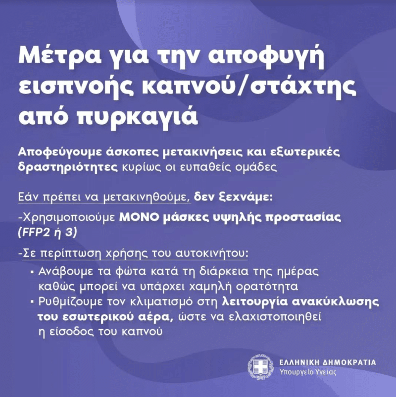 - Αποφύγετε άσκοπες μετακινήσεις και εξωτερικές δραστηριότητες, κυρίως οι ευπαθείς ομάδες (άτομα με αναπνευστικά ή καρδιαγγειακά νοσήματα, ηλικιωμένοι, παιδιά, έγκυες) όσο υπάρχει καπνός και στάχτη.
