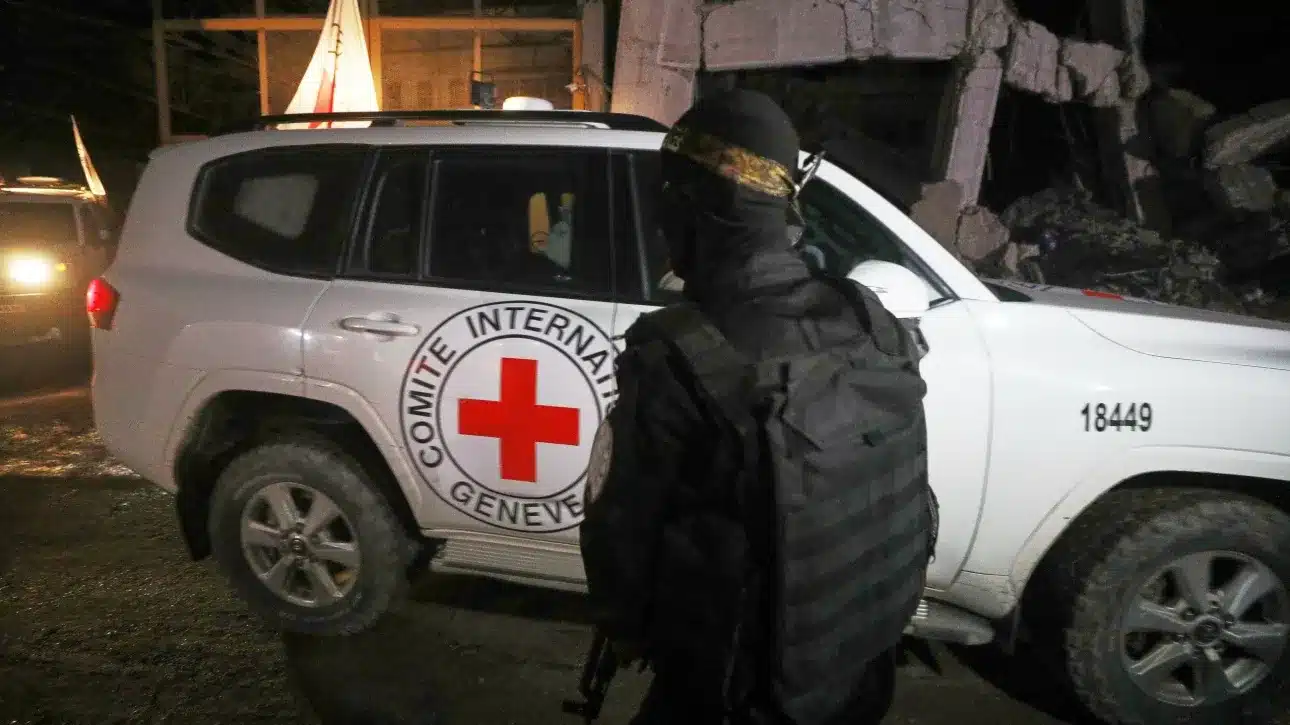 Στη φωτογραφία που δημοσίευσε το Associated Press, ένοπλος των Ταξιαρχιών αλ Κασάμ, της στρατιωτικής πτέρυγας της Χαμάς, φαίνεται να φρουρεί καθώς οχήματα του Ερυθρού Σταυρού μεταφέρουν φέρετρα με τις σορούς τεσσάρων νεκρών ομήρων από αποθήκη της πόλης της Γάζας προς το Ισραήλ.