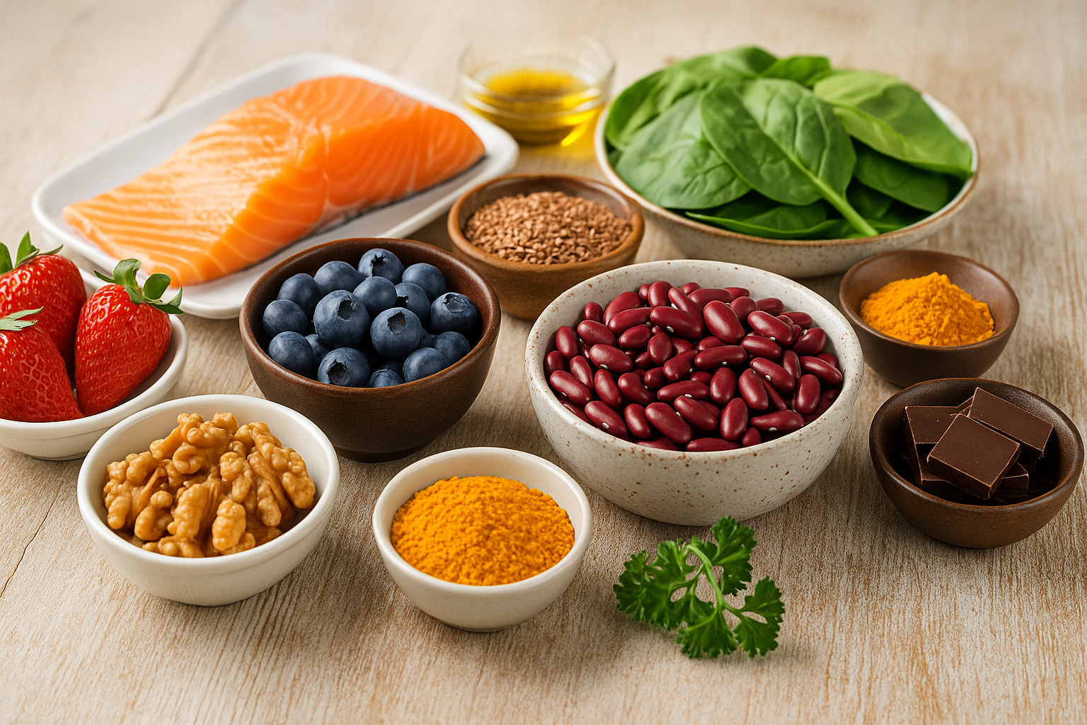 Κουρκουμίνη (από τον κουρκουμά) και άλλα αντιφλεγμονώδη μπαχαρικά: Έχουν ισχυρές αντιοξειδωτικές και αντιφλεγμονώδεις ιδιότητες. Συμβάλλουν στη υγιή γήρανση, ιδίως όταν εντάσσονται σε δίαιτα φυτικής βάσης. Η φυσική κατανάλωση θεωρείται πιο ασφαλής από τα συμπληρώματα χωρίς ιατρική επίβλεψη.
