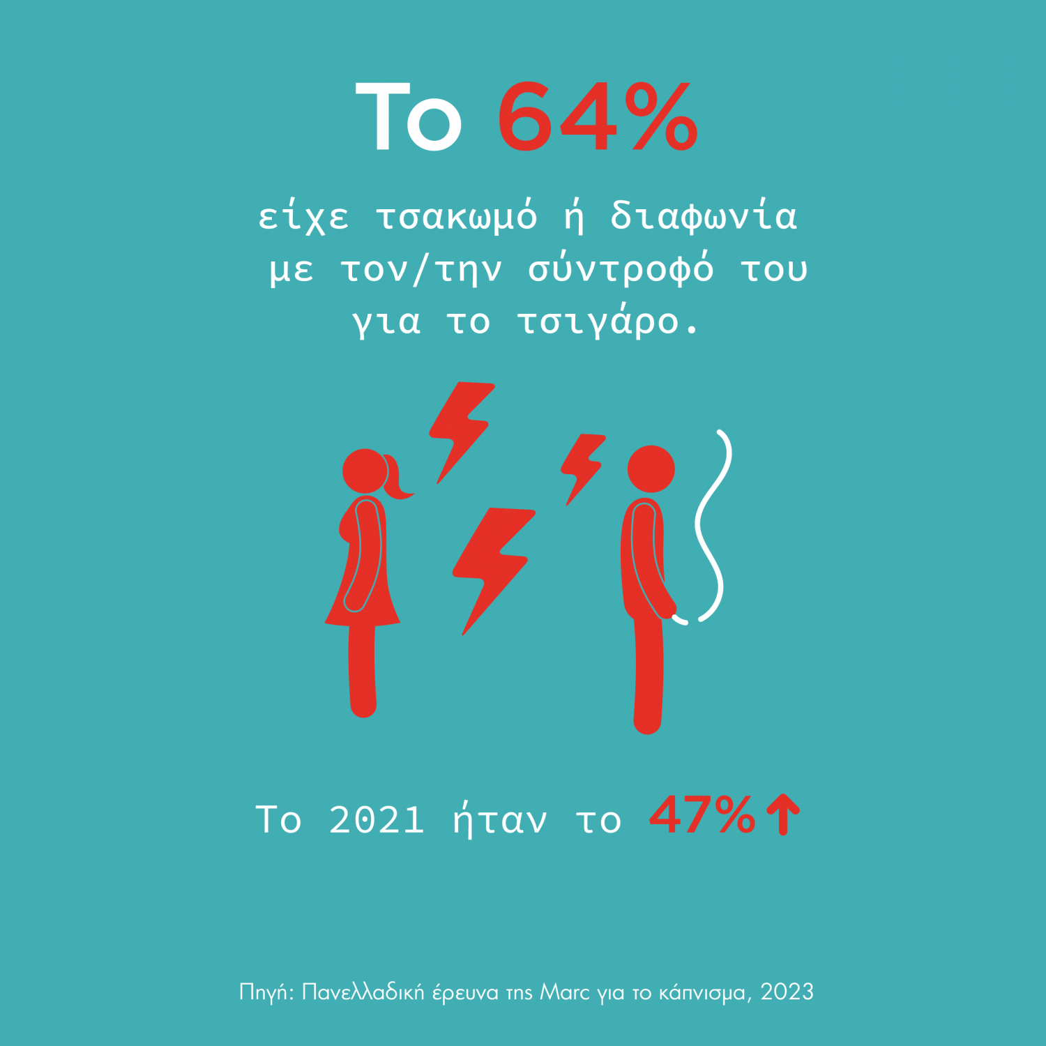 Σε βάθος τριετίας παρατηρείται αύξηση σχεδόν 10 ποσοστιαίων μονάδων στους μη καπνιστές που δηλώνουν ότι ενοχλούνται από την καπνιστική συνήθεια του/της συντρόφου τους (51,7% το 2021, 59,2% το 2022 και 62,3% το 2023). Αντίστοιχα, το ποσοστό των καπνιστών που αναφέρουν εντάσεις ή τσακωμούς με άτομα του κοινωνικού τους περιβάλλοντος εξαιτίας του καπνίσματος αυξήθηκε κατά 9 σχεδόν ποσοστιαίες μονάδες (38,8% το 2021, 42,8% το 2022 και 47,5% το 2023).