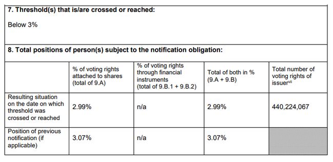 Ειδικότερα, σύμφωνα με τα στοιχεία που κοινοποίησε η εισηγμένη στο Χρηματιστήριο Αθηνών, το ποσοστό των δικαιωμάτων ψήφου της CarVal διαμορφώνεται πλέον σε 2,99%, από 3,07% που κατείχε προηγουμένως.