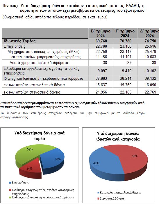 Η ονομαστική αξία των υπό διαχείριση δανείων προς ιδιώτες και ιδιωτικά μη κερδοσκοπικά ιδρύματα αυξήθηκε κατά 918 εκατ. ευρώ έναντι του προηγούμενου τριμήνου και διαμορφώθηκε σε 39.132 εκατ. ευρώ στο τέλος του δ΄ τριμήνου του 2024.
