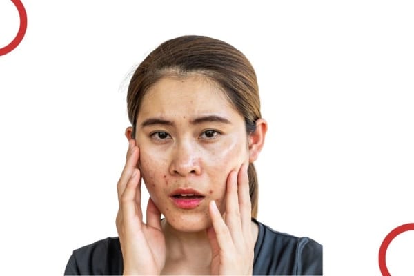 Πιο σκούρα ή αποχρωματισμένα μπαλώματα παραμένουν μετά την επούλωση της ακμής. Αυτό δεν είναι ουλή και υποχωρεί με την πάροδο του χρόνου με την κατάλληλη αντηλιακή προστασία.